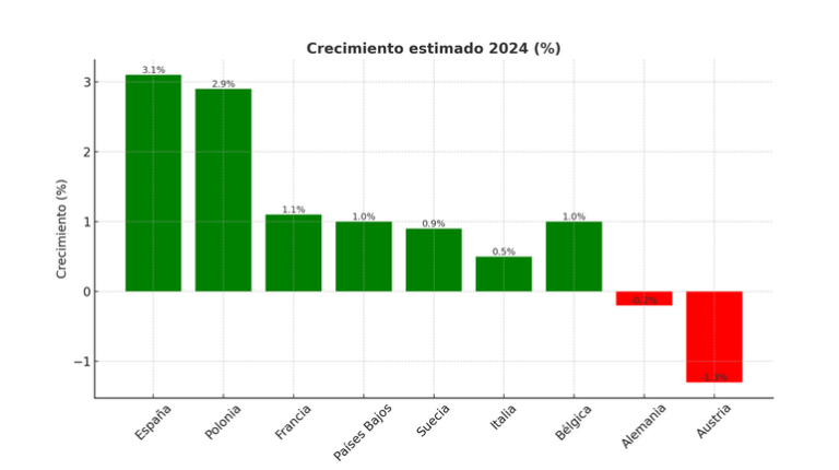 En 2024, Alemania tuvo una ligera contracción del -0,2% del PIB, y en 2025 se espera un crecimiento muy ligero o prácticamente nulo. Francia también tuvo un crecimiento bajo en 2024, de un 1,1%, y en 2025 se espera que baje a un 0,6% – 0,8%.