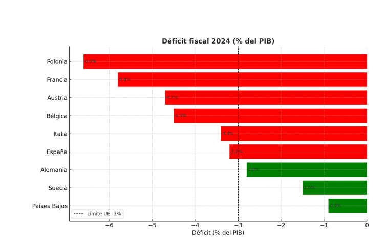 El déficit fiscal de Alemania en 2024 fue de -2,8%, destacando negativamente el de Francia con un -5.8%, con mala proyección debido a la inestabilidad política. (En el gráfico, la línea discontinua marca el umbral del -3% exigido por la UE).