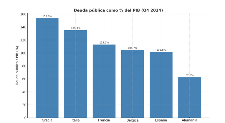 En cuanto a la deuda pública, Alemania tiene un 63% sobre el PIB en 2024 (muy buen dato) y Francia un 113% en 2024.