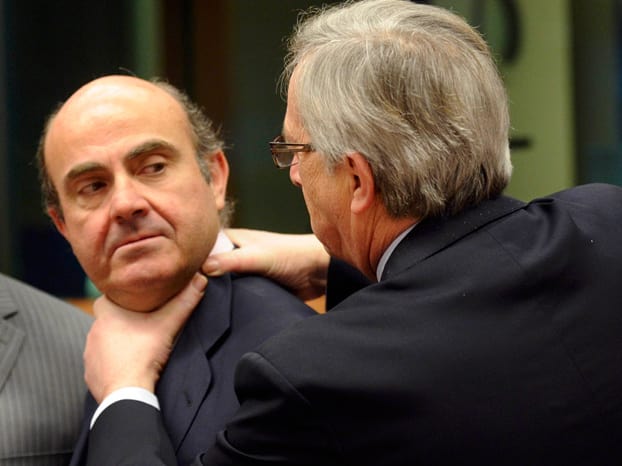 «Tengo el honor de dirigirme a usted en nombre del Gobierno de España, para solicitar formalmente asistencia financiera para la recapitalización de las entidades financieras españolas que así lo requieran». Con una nota de prensa apresurada y deslabazada (se repite 13 veces la palabra “financiera” en 5 párrafos), el ministro de Economía, Luis de Guindos, rubricó el mal trago de tener que inclinarse ante el presidente del Eurogrupo, Jean-Claude Juncker. El euro exige la genuflexión en un día en el que se ha conocido además que los “hombres de negro” están ya en España y se han instalado tanto en el Banco de España, el Ministerio de Economía como incluso en la propia Moncloa. Y hay veces en que una imagen vale más que mil palabras, pues la curiosa fotografía que ilustra este artículo no es un montaje: recoge el momento en que Juncker saluda a De Guindos en tono aparentemente distendido durante la última reunión del Eurogrupo.