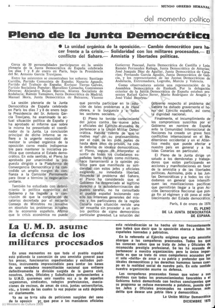 En enero de 1976 tiene lugar en París un pleno de la Junta Democrática a la que asisten unos cincuenta representantes de los partidos y personalidades de la Junta y se trata, entre otros temas, la unidad de la oposición. Dice así la declaración del Pleno: «La sesión plenaria de la Junta Democrática de España celebrada en París los días 7 y 8 de enero bajo la Presidencia del Sr. Antonio García-Trevijano, ha examinado la actual situación política de España y ha aprobado el informe que sobre la misma ha presentado el coordinador de la Junta. La conclusión principal de dicho informe se refiere a la urgente necesidad de realizar la unidad orgánica de la oposición como medio indispensable para mantener la iniciativa política que conduzca al Estado democrático. En este sentido, el Pleno ha aprobado por unanimidad la propuesta dirigida a la Plataforma de Convergencia Democrática y ha concedido un amplio margen de confianza a la Comisión Permanente para llevar a término la negociación unitaria». [5]