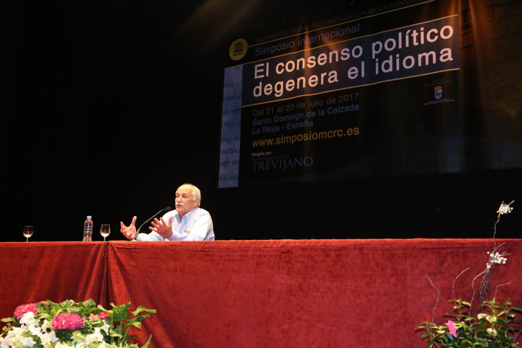 El simposio internacional «El consenso político degenera el idioma», organizado por el Movimiento Ciudadano hacia la República Constitucional (MCRC), ha sido inaugurado esta mañana en el Teatro Avenida de la localidad riojana de Santo Domingo de la Calzada. Durante la jornada de hoy tendrán lugar cuatro conferencias y una mesa redonda.
