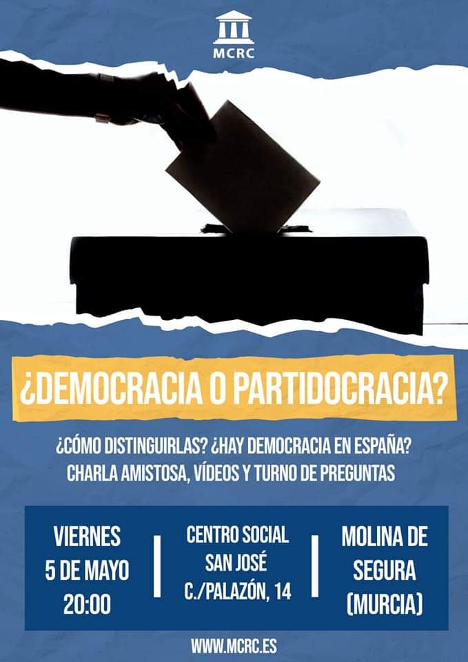 El pasado 5 de mayo tuvo lugar en el Centro Social San José y los Ángeles, situado en Molina de Segura (Murcia), la charla «¿Democracia o partidocracia?».