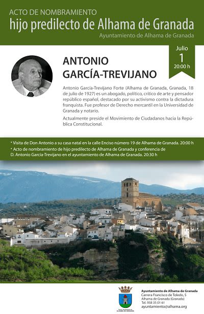 El repúblico Antonio García-Trevijano, fundador y presidente del Movimiento Ciudadano hacia la República Constitucional (MCRC), será nombrado hijo predilecto en su ciudad natal, Alhama de Granada el próximo sábado 1 de julio. García-Trevijano nació en el número 19 de la alhameña calle Enciso en julio de 1927, cuando se padre era el registrador de la propiedad local.