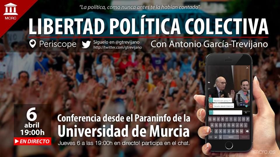 Hoy jueves 6 a las 19:00h, a través de Periscope, emisión en directo de la conferencia de Antonio García-Trevijano «Libertad política colectiva» desde el paraninfo de la Universidad de Murcia.