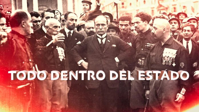 “(…) Ni agrupaciones (partidos políticos, asociaciones, sindicatos), ni individuos fuera del Estado (…). El fascismo quiere un Estado fuerte, poderosamente