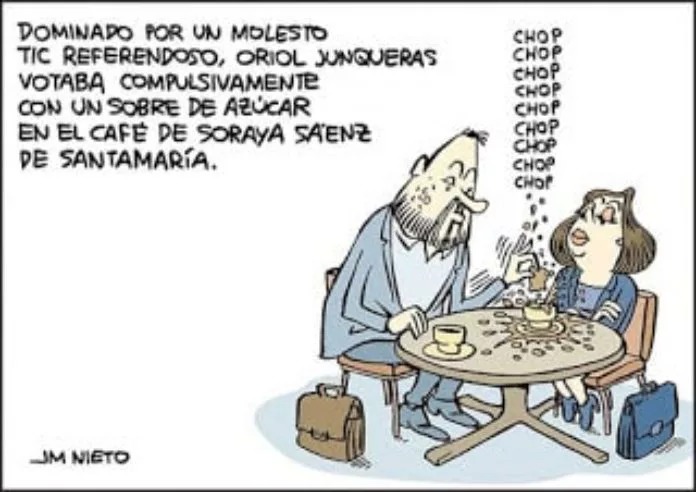 En una viñeta de ABC, “El tic de Oriol”, sienta Nieto en un velador a Oriol Junqueras pescando con un fartón en el café