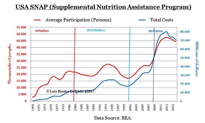 Así que tras ocho años de «gestión» y aumentar la deuda en 9,3 billones (trillones allí, o casi nueve veces el PIB de España) de dólares, el PIB nominal solo aumentó 4,3 billones, resultando en una tasa de paro oficial del 5% y en que las personas que reciben ayudas a la alimentación (El SNAP, siguiente gráfica, eje izquierdo), crecieron en casi 15 millones, totalizando casi 45 millones en un país con 134 millones de «hogares».